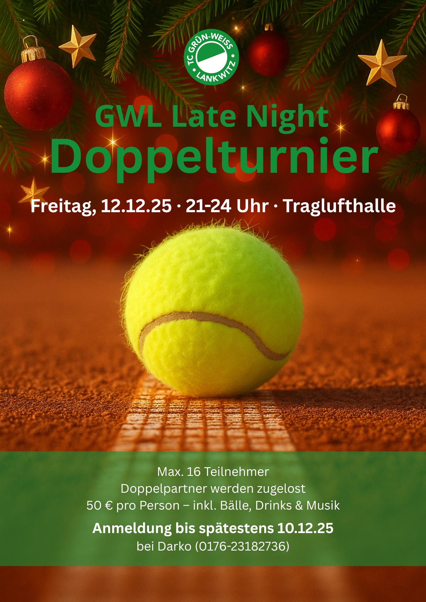 Am 12. Dezember verwandelt sich unsere Traglufthalle wieder in eine kleine vorweihnachtliche Tennisbühne. Drei Stunden lang heißt es: Doppel, Musik und gute Stimmung – organisiert von Darko und Igor.