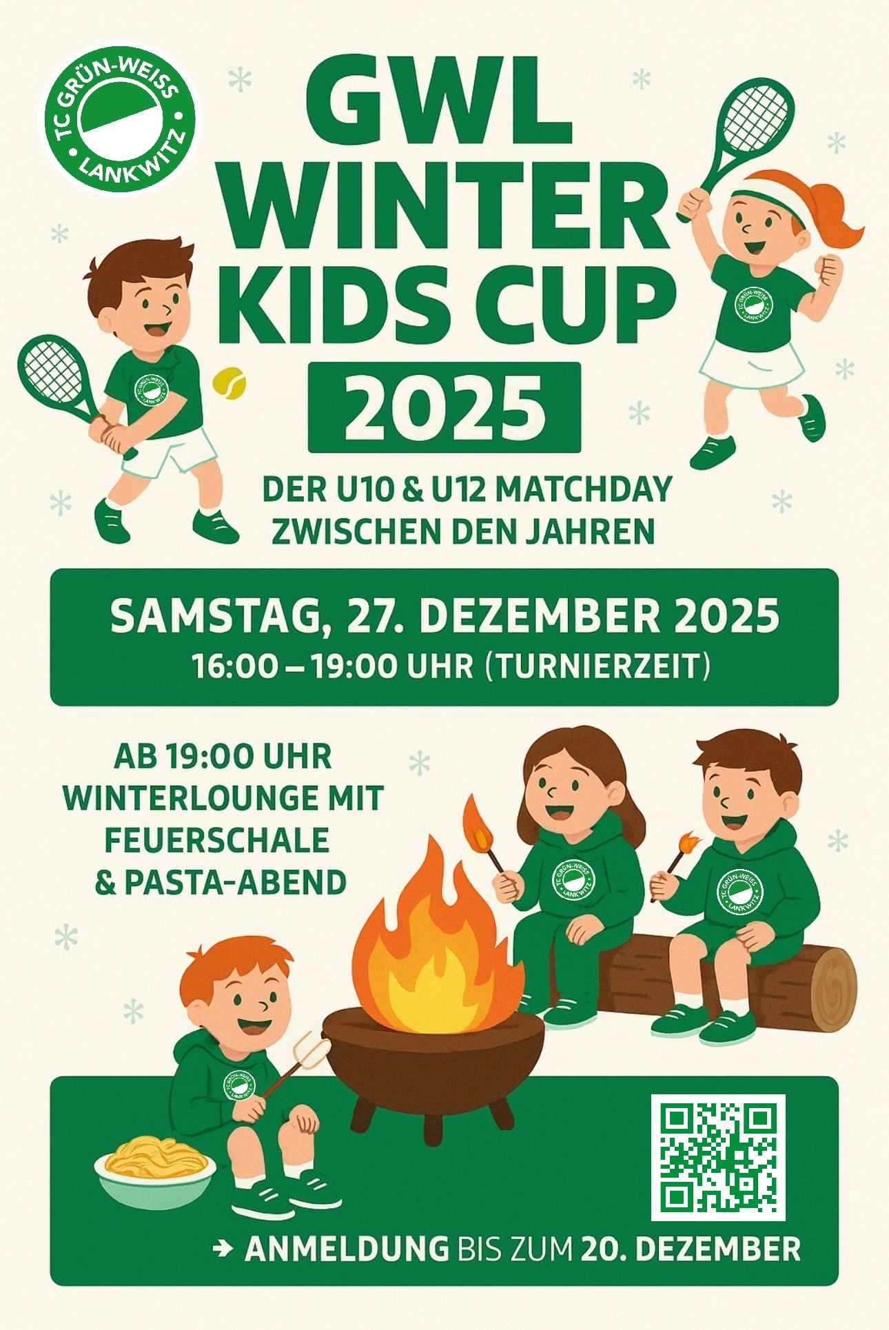Vor dem Jahreswechsel wird’s für unsere Jüngsten noch einmal richtig sportlich! Am Samstag, 27. Dezember treten die U10- und U12-Kids beim GWL Winter Kids Cup an. Darko steht gerade mit benachbarten Vereinen in Kontakt, so dass es sehr wahrscheinlich auf eine kleine sportlichen Vergleichsherausforderung für die Kids hinauslaufen wird.